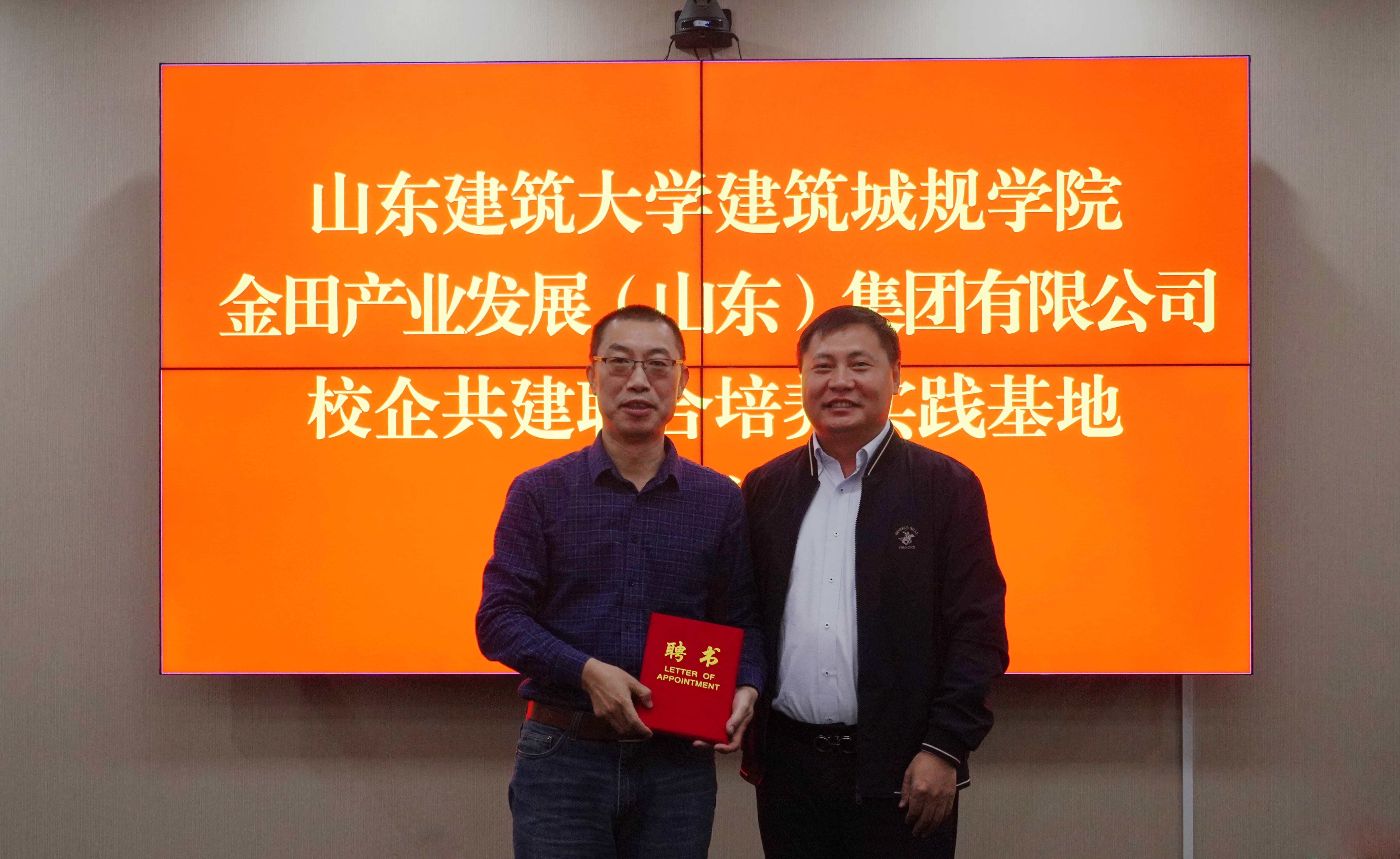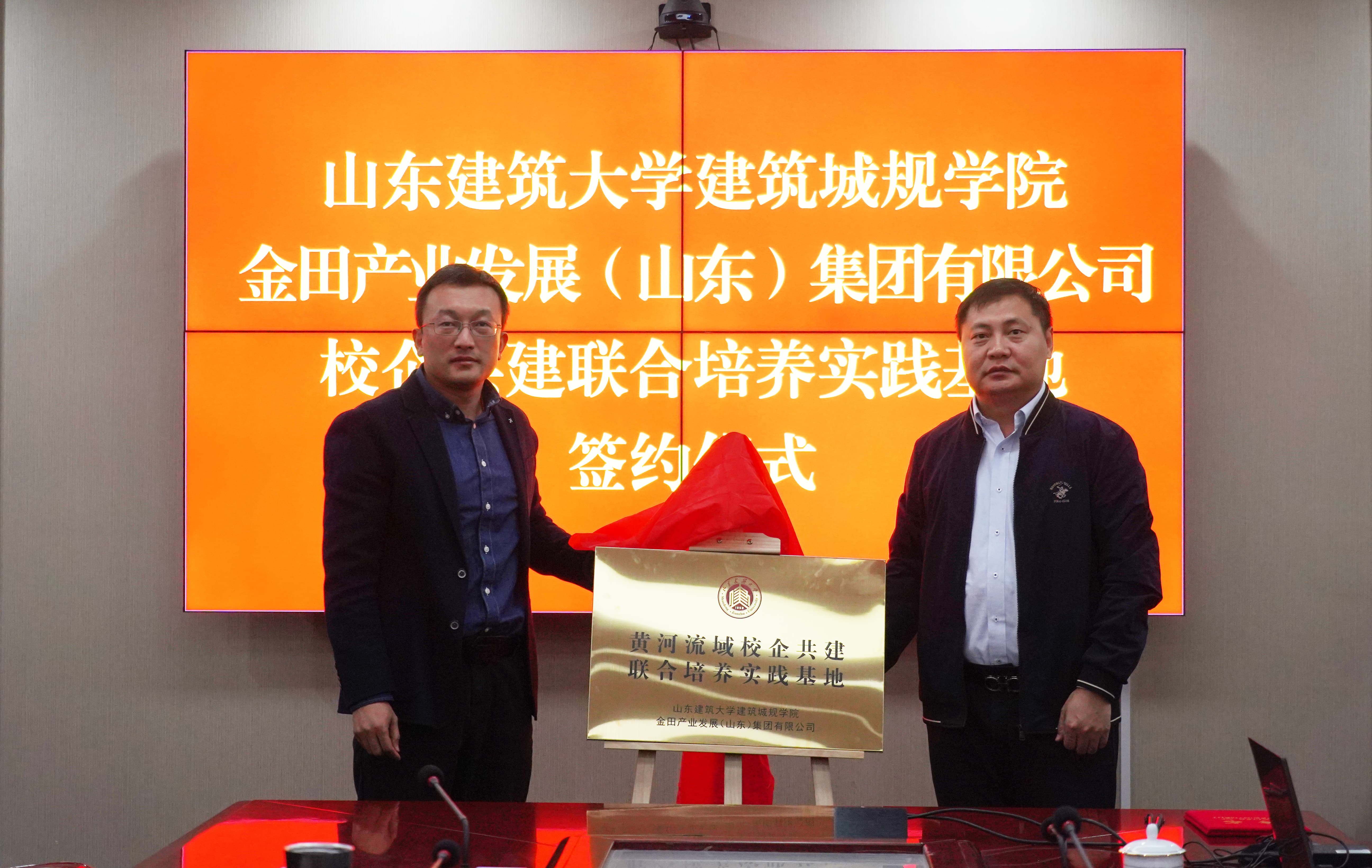 山東建筑大學(xué)教授、建筑城規(guī)學(xué)院副院長(zhǎng)趙亮,金田產(chǎn)業(yè)發(fā)展集團(tuán)董事長(zhǎng)魏卿作為簽約代表簽署校企共建聯(lián)合培養(yǎng)實(shí)踐基地協(xié)議并揭牌。