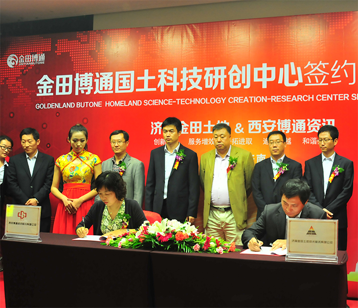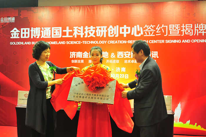 濟(jì)南金田土地技術(shù)服務(wù)有限公司和西安交大博通資訊股份有限公司合作簽約儀式,暨金田博通國(guó)土科技研創(chuàng)中心揭牌儀式于2014年10月23日舉行。